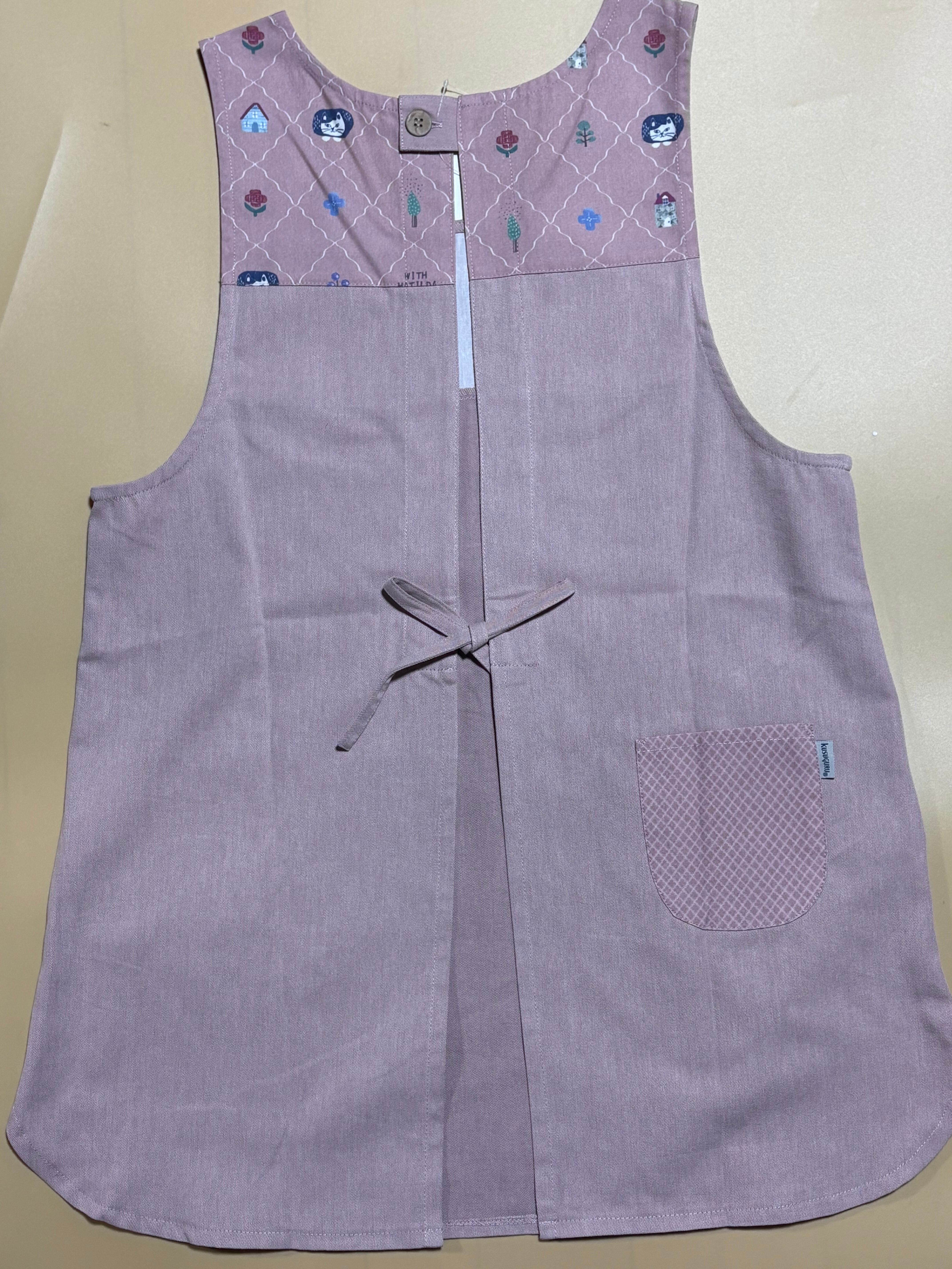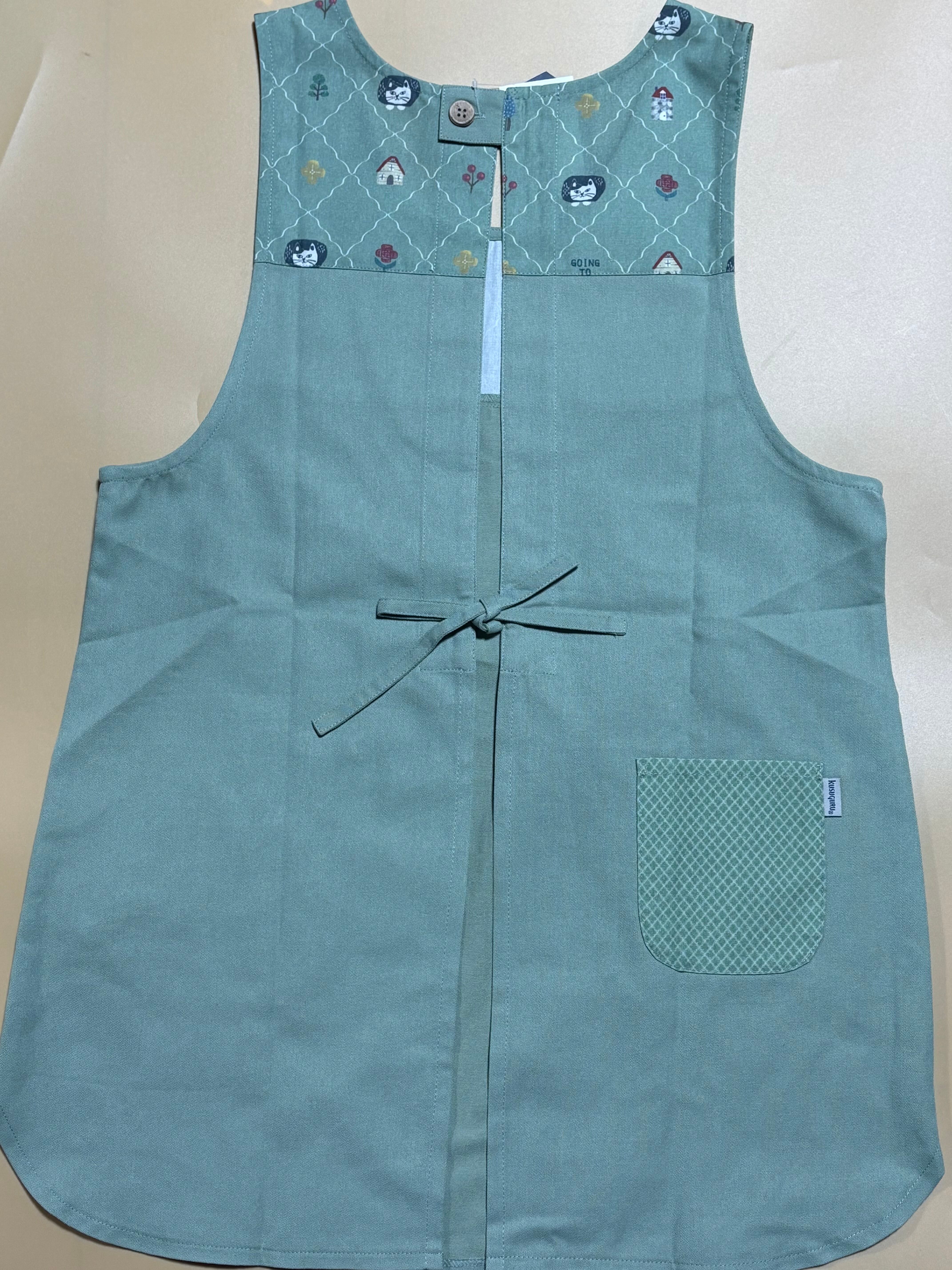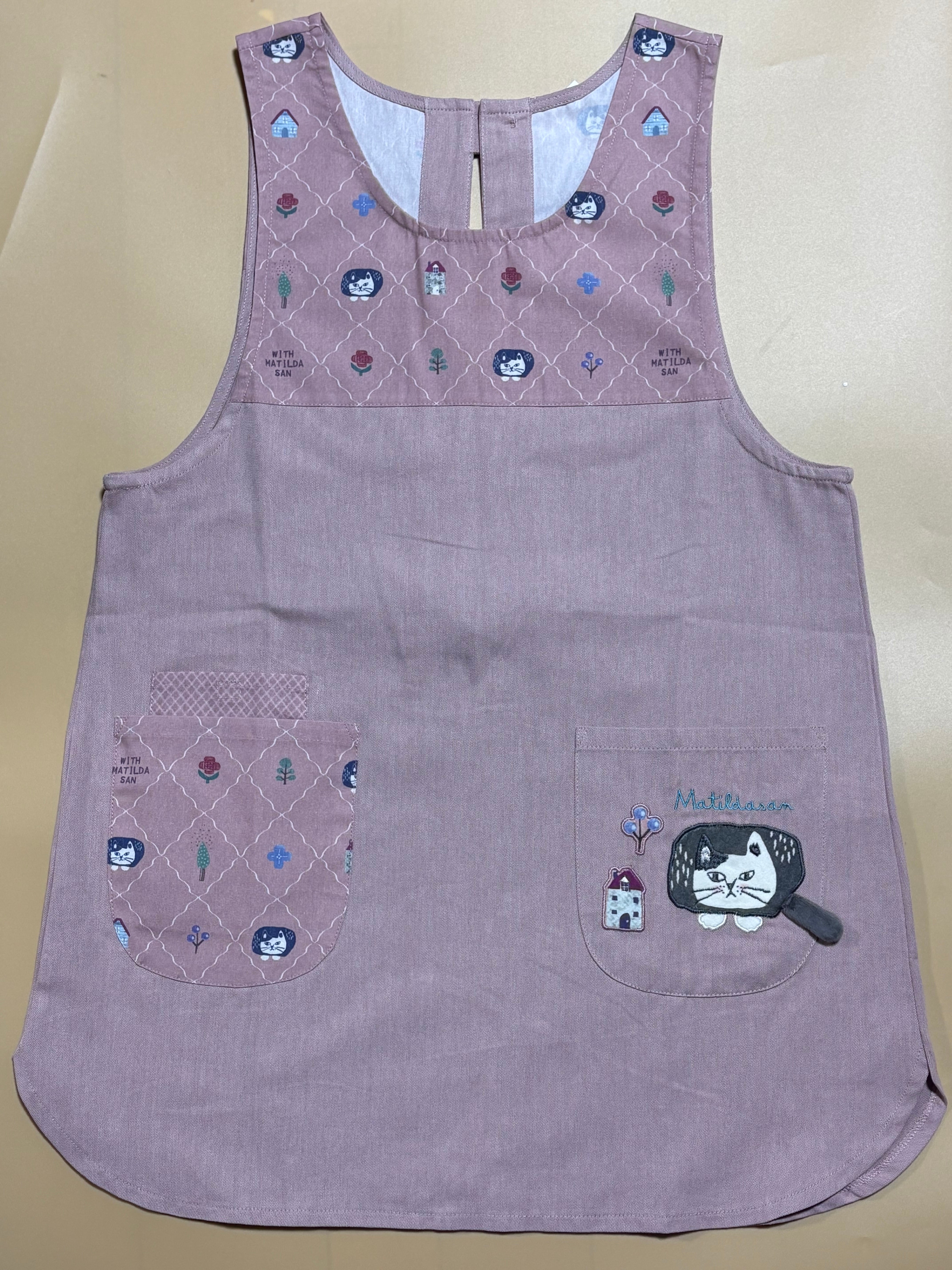 着脱しやすい脇あきエプロン。ポケットのマチルダさんのしっぽがはみ出してます。